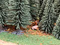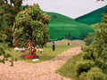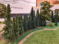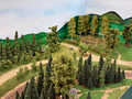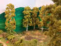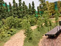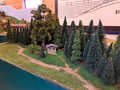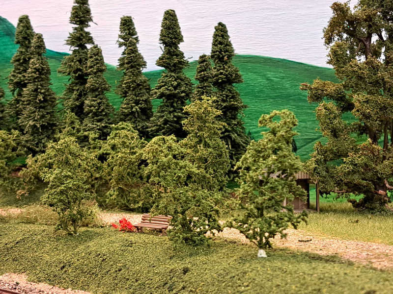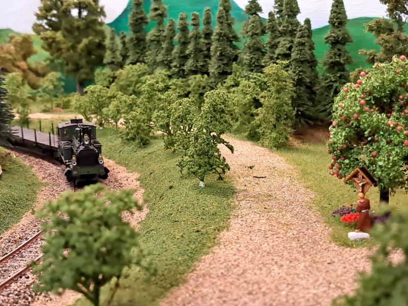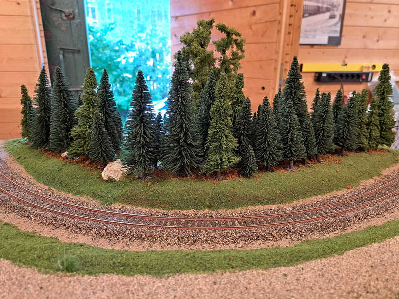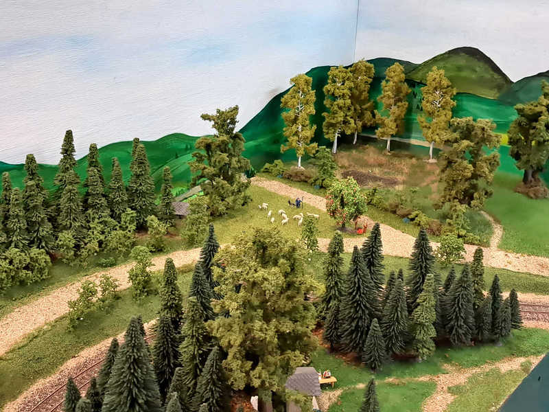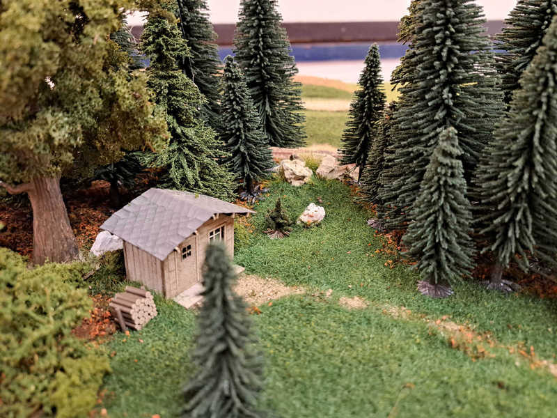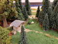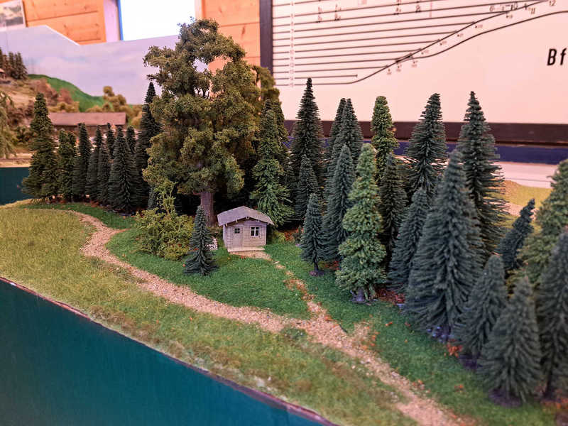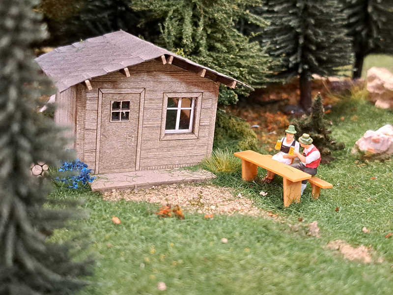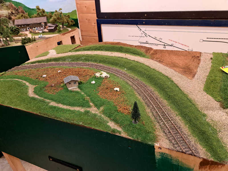 Ludwig und Stefan haben sich dem Eckmodul angenommen und die Landschaft fertig gestaltet. Auf dem Eckmodul setzten wir viele Bäume und Sträucher. Eine kleine Holzhütte mit einem Freisitz sowie auf der anderen Seite des Gleises stellten wir ein kleines Marterl auf und gesellten einen Schafhirten mit seiner Herde dazu.