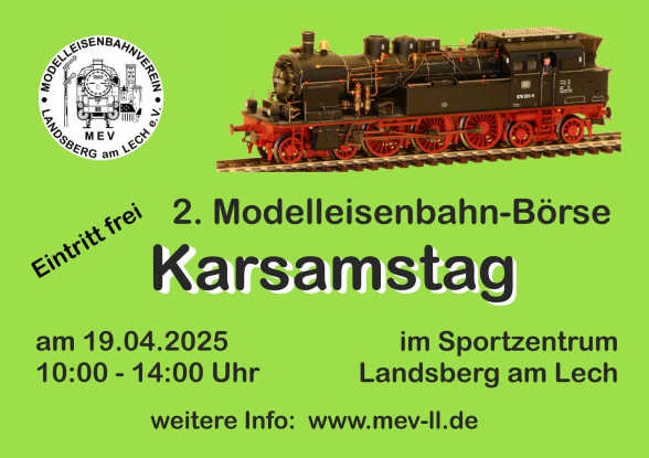 Am 19.04.2024 führt der Modellesienbahnverein Landsberg am Lech e. V. seine zweite Modelleisenbahnbörse im Sportzentrum Landsberg, Hungerbachweg 1, 86899 Landsberg am Lech, durch.